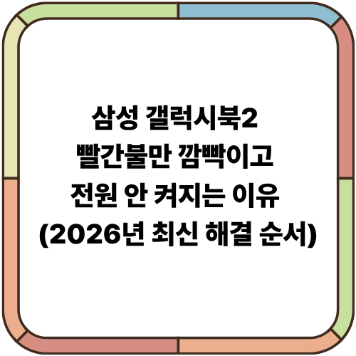 삼성 갤럭시북2 빨간불만 깜빡이고 전원 안 켜질 때 해결 방법(2026년 최신)을 정리했습니다. 배터리 완전 방전, 충전기 문제, 전원 보호 상태 점검 순서부터 서비스센터 점검 기준까지 단계별 해결 가이드입니다.