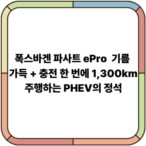 **폭스바겐**의 **파사트 ePro**는 플러그인 하이브리드(PHEV)의 강점을 극대화한 모델로, 전기 주행 150km + 내연기관 주행 1,150km = 총 1,300km라는 압도적인 주행거리를 제공합니다. “충전 스트레스 없는 장거리 PHEV”를 찾는 운전자에게 정확히 들어맞는 콘셉트입니다.