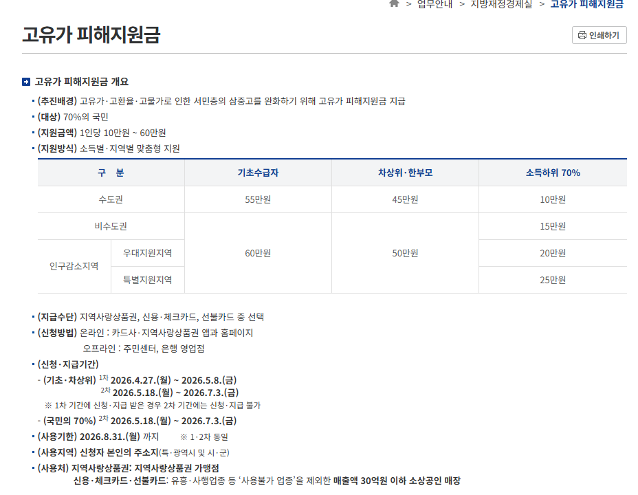 2026년 고유가 피해지원금 지급 일정 총정리 (최대 60만 원)|소득하위 70% 기준·신청 방법·사용처 안내